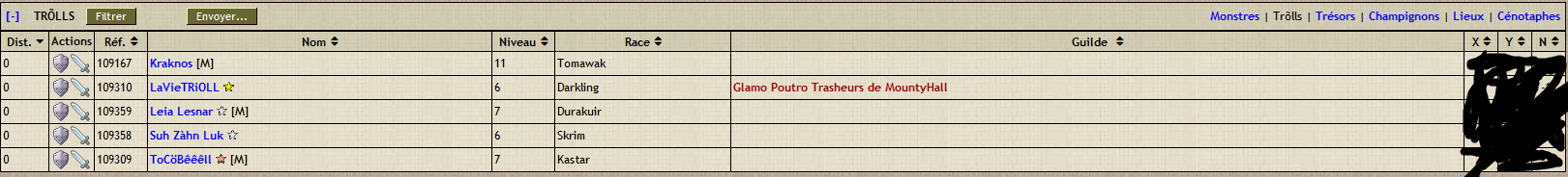 dans ma vue, je ne vois plus directement pour les trolls ni les guildes, ni les races.... pas pratique du tout!!! ce serait possible d'afficher au moins ces renseignements directement sur la vue sans devoir cliquer sur la croix dans la colonne distance???
