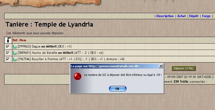 Je demande ma Gros'Porte, commandée un mois avant, et il me dit que c'est 2PA. Je clique, puis il me dit qu'il manque 10UM (j'etais au courant, je les avais sur moi). Et la, un bouton "Donner le Mithril (1PA)".