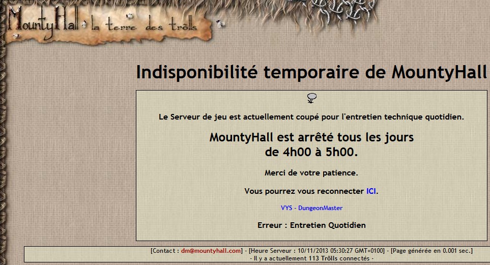 Pour des besoins techniques, MountyHall est arrêté tous les jours de 4h00 (GMT +2) pour la maintenance (durée environ entre 0h50 et 1h30) .