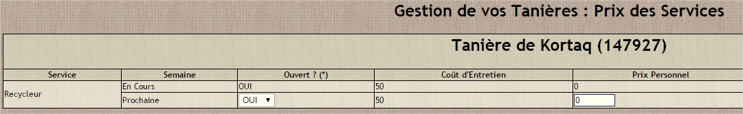 Voici le message de l'entretien " Liste des Services de cette Tanière et leur cout en GG'. Entretien de Base : 100
