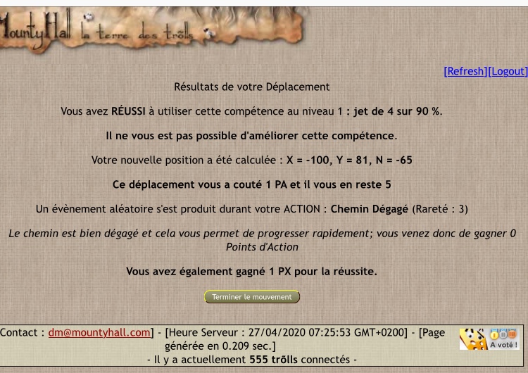 Le chemin est dégagé et cela vous permet de progresser rapidement; vous venez donc de gagner 0 Points d'Action