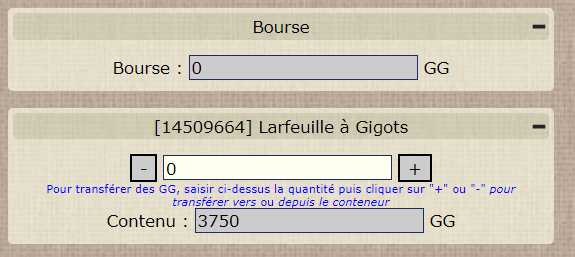 Dans l'écran transbahutage, je peux transvaser des gg depuis le conteneur (qui indique une valeur) vers la bourse, mais la bourse m'indique 0 gg transvasable vers le conteneur (ce qui est incorrect).