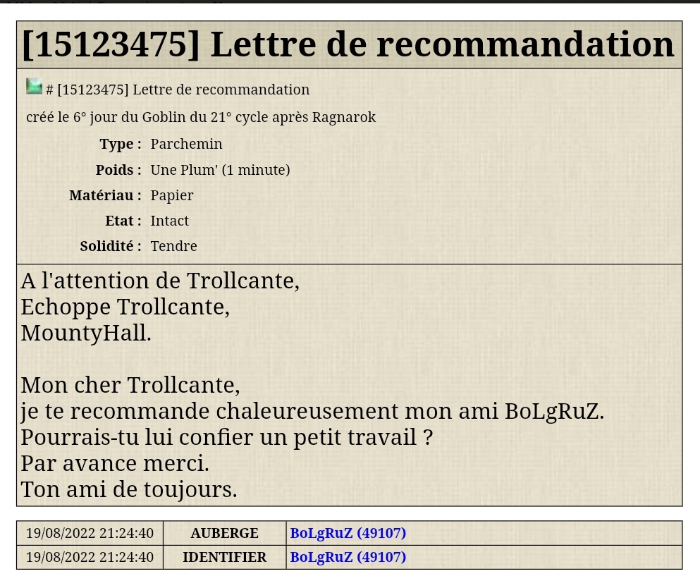 J'ai eu trop de la chance, j'arrive en auberge ( 1066051 Auberge : Le tonneau rondouillard) ,le PNJ est fraternel, je discute une fois et il me donne une lettre de recommandation mais j'ai du mal à situer le lieu ....