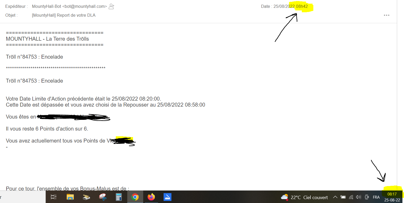 Votre Date Limite d'Action précédente était le 24/08/2022 22:14:00. Cette Date est dépassée et vous avez choisi de la Repousser au 25/08/2022 08:20:00 2. A 8h17, je me connecte et je reçois le message me disant que ma DLA est dépassée !