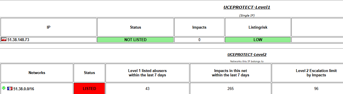 utlook.fr (et hotmail.fr) utilisent la liste de RBL "peu fiable/agressive/profiteur" UCEPROTECTL2 et UCEPROTECTL3 qui banni régulièrement des ranges entières de serveurs. Pas de bol, le nouveau serveur fait partie d'une range de ce genre.