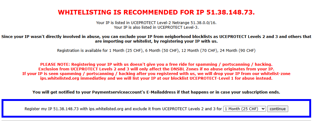 utlook.fr (et hotmail.fr) utilisent la liste de RBL "peu fiable/agressive/profiteur" UCEPROTECTL2 et UCEPROTECTL3 qui banni régulièrement des ranges entières de serveurs. Pas de bol, le nouveau serveur fait partie d'une range de ce genre.