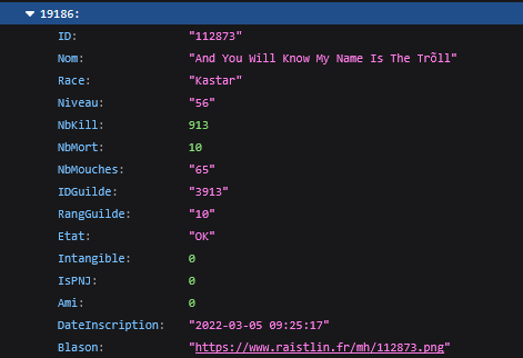 dans le cadre de trucs que je bricole, j'importe un certain nombre de fichiers publics, dont https://ftp.mountyhall.com/Public_Trolls2.json