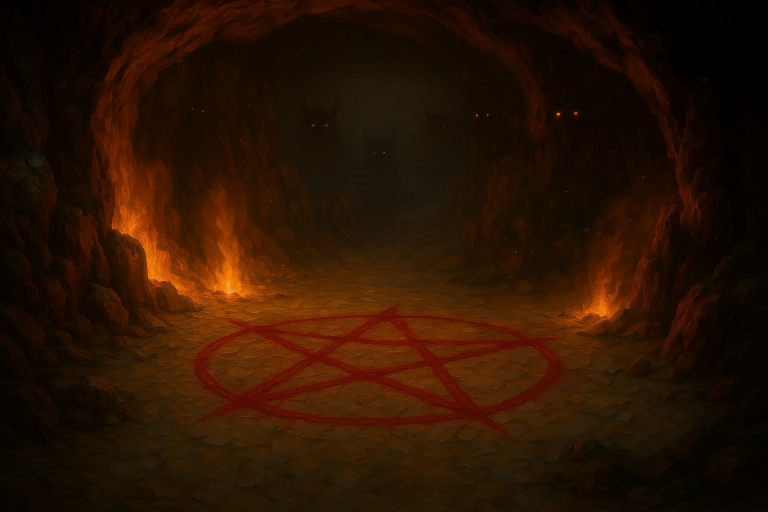 La chaleur du Hall était suffocante, presque vivante. Au sol, une immense étoile à cinq branches peinte avec du sang dominait le temple démoniaque. Rien ici n’invitait à rester, sauf mon démon qui me parlait et me disait que j'étais là ou je devais être. L’impression d’être épié ne venait pas d’un couloir ou d’une ombre — elle venait du lieu lui-même. Le pentacle existait déjà dans le Hall, ancien, fixe, chargé d’une puissance primitive. Et quelque part ailleurs dans ce même Hall se dressait le temple que nous avions décidé de profaner. Notre objectif n’était pas de créer ces lieux… mais d’établir une liaison entre eux pour faire venir quelque chose des enfers profonds : un artefact scellé, une relique oubliée, un monstre mythique, peut-être même un dieu des abîmes.